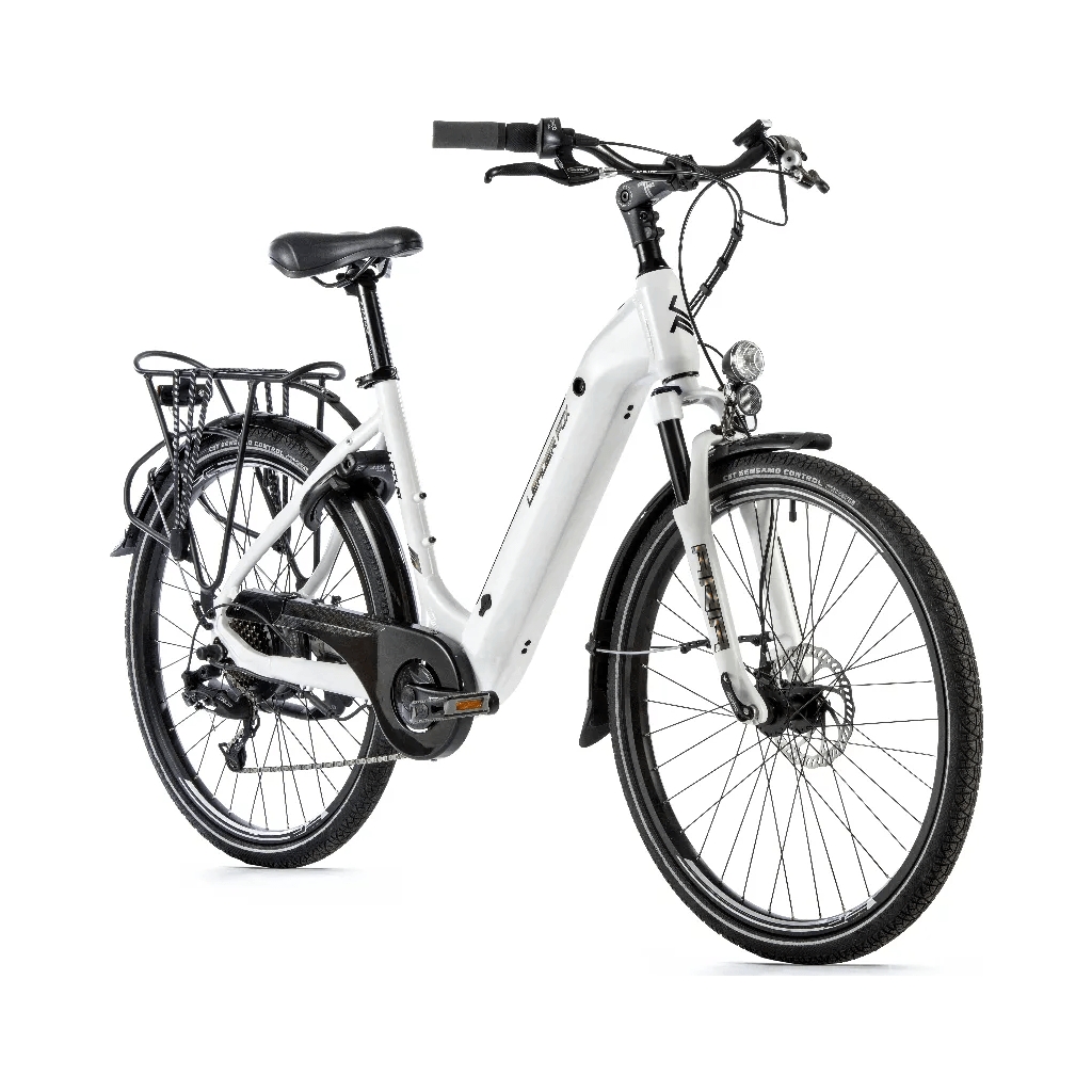 Das City-E-Bike Leader Fox LOTUS 26" mit Aluminiumrahmen, Federgabel und Scheibenbremsen ermöglicht dank seines eleganten, urbanen Designs ein bequemes Aufsteigen.